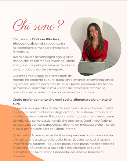All’interno troverai un percorso completo per riequilibrare ormoni, intestino e alimentazione, con consigli pratici e un piano alimentare settimanale ispirativo pensato per favorire una pelle più luminosa e uniforme.
