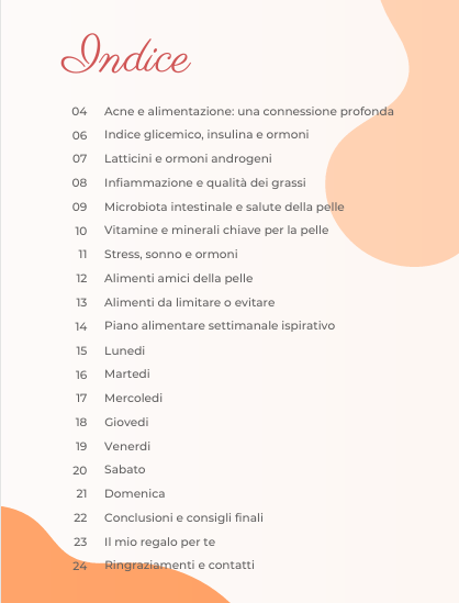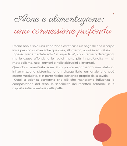Attraverso spiegazioni semplici e basate sulla scienza, l’eBook ti aiuterà a riconoscere i fattori che influenzano la comparsa di acne e imperfezioni — come zuccheri, stress e infiammazione — e a sostituirli con abitudini sane e nutrienti.